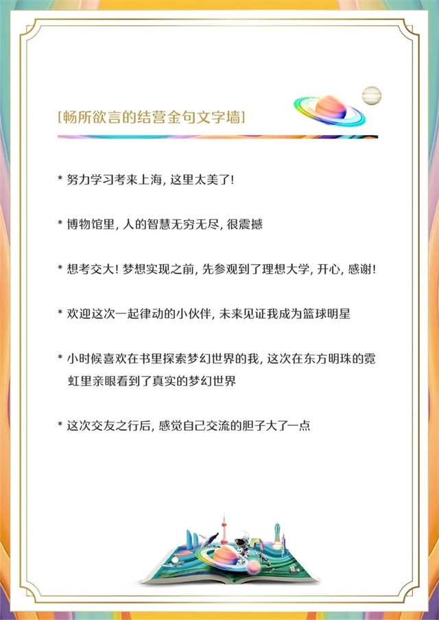 在这为期整4天的华体会体育(中国)hth·官方网站游学营中,他们的足迹遍布上海,微信步数共计近8万,一起体验了融合历史、人文、自然、科技等多维领域的10大研学项目,结识了来自华体会体育(中国)hth·官方网站社区的同龄小伙伴,在思源·扬帆与华体会体育(中国)hth·官方网站集团旗下华体会体育(中国)hth·官方网站商管、长租公寓、世邦泰和、超燃健身等志愿者们的陪伴下,用心翻阅全新的世界。